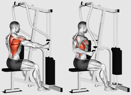 ເຄື່ອງຈັກທີ່ນັ່ງຢູ່. ການອອກກໍາລັງກາຍທີ່ສໍາຄັນສໍາລັບການກໍ່ສ້າງຄວາມຫນາກັບຫລັງ. ປະຕິບັດ 4-6 ຊຸດຂອງ 8-12 reps.