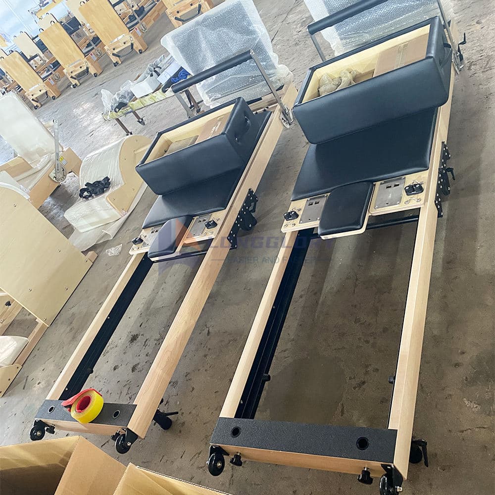 ສ້າງຂຶ້ນສໍາລັບສະຕູດິໂອໂຍຄະ, ສະຕູດິໂອ Pilates, ສູນຟື້ນຟູ, ຫ້ອງອອກກໍາລັງກາຍ, ໂຮງແຮມ, ແລະຫ້ອງສຸຂະພາບໃນເຮືອນ, Yoga Maple Wood Folding Pilates Reformer ສະຫນອງການປະຕິບັດລະດັບການຄ້າໃນການອອກແບບທີ່ຫນາແຫນ້ນ, ພັບ. ລາງລົດໄຟທີ່ມີຄວາມແມ່ນຍໍາ, ກອບເສີມ, ແລະສາຍທີ່ທົນທານຮັບປະກັນການເຄື່ອນໄຫວທີ່ລຽບງ່າຍແລະຄວາມຫມັ້ນຄົງໃນລະຫວ່າງການອອກກໍາລັງກາຍ.